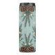 The mouse is dressed in a red Santa hat with white trim and a matching red sweater adorned with white snowflakes. It is nestled snugly within a traditional Christmas wreath made of pine branches, red berries, and golden/yellow ornaments, tied with a red ribbon bow. The background is a soft dusty blue/teal with subtle snowflakes and the corners are framed by decorative elements like large pinecones and pine sprigs. The design is whimsical, cheerful, and captures the sweet innocence of the holiday season