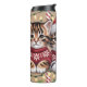 This is an incredibly sweet and detailed holiday illustration featuring three adorable kittens seated side-by-side against a warm, tannish-brown background decorated with festive elements. The kittens are the focal point, each dressed in a unique Christmas sweater and hat.