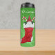 Esta botella termal de tambor para mantener las bebidas frías o calientes es verde con los suaves remolinos y un gnomo con barba blanca dentro de un Navidad rojo y blanco lleno de latas de dulces y hojas huecas. Personalizar tu nombre con la plantilla.