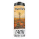 Este gráfico apacible representa un campo de calabazas con una cruz en el centro bajo un cielo artístico y dorado. El diseño incluye la inspiradora frase 'FE EN CADA TEMPORADA', que crea una pieza pacífica y espiritual que combina la fe con las imágenes de la caída.