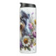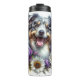 Un hermoso Pastor Australiano con llamativas marcas tricoloridas y una sonrisa ancha y alegre está rodeado por una vibrante y colorida variedad de girasoles, peonías púrpura y daisies blancas. Las suaves salpicaduras de acuarelas realzan el ambiente alegre y artístico de este encantador retrato canino.