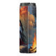 Una mujer nativa norteamericana con atuendo tradicional blanco y rojo se sienta cuidadosamente en una roca a orillas de un río, mirando atentamente hacia un majestuoso águila calva que desciende con alas estiradas. En primer plano brilla una cálida hoguera, mientras que el follaje otoñal y las montañas lejanas contribuyen a la serena pero poderosa escena del desierto.