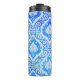 la pared de la iglesia está decorada con azulejos de cerámica con motivos tailandeses azules.