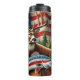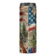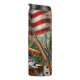 Un majestuoso ciervo con impresionantes ángulos mira hacia delante, colocado sobre una trucha vibrantemente colorida diseñada con rayas de la bandera estadounidense. Al lado de los peces hay un fusil con un alcance, una caña de pescar y un carrete, todo ello rodeado de un entorno rústico de madera con una bandera estadounidense y pinos.