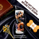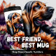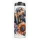 Un digno Bloodhound con una expresión suave y su lengua ligeramente fuera está situado pacíficamente entre un bello arreglo de girasoles de tono cálido y grandes peonías violetas. Las sutiles salpicaduras de acuarela en el fondo le dan un toque artístico y apacible a este gentil retrato canino.