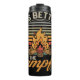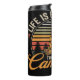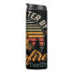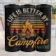 Este atractivo gráfico muestra la frase "LA VIDA ES MEJOR POR EL Fogón", rodeada por una estilizada hoguera con troncos y llamas cálidas. El fondo muestra una vibrante puesta de sol a rayas detrás de pinos de silueta. Este diseño de estilo vintage captura perfectamente el disfrute pacífico y la belleza natural del camping y la relajación al aire libre.