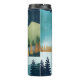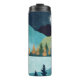 Un hermoso paisaje con texturas únicas que muestran un paisaje de lago montañoso con una luna en alza y un cielo estrellado en tonos azules, dorados, verdes y turquesas.
