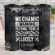 Este gráfico muestra una advertencia humorística para cualquiera que esté alrededor de un mecánico, ambientado en un oscuro fondo industrial de placa de diamante. El texto en negrita y blanco, acentuado por triángulos de peligro e íconos de llave, dice: "HERRAMIENTAS DE VOLACIÓN DE ADVERTENCIA MECÁNICA Y LENGUAJE OFENSIVO PROBABLEMENTE". Este diseño refleja de manera lúdica el ambiente intenso y a menudo volátil de una concurrida tienda de automóviles, perfecta para prendas de vestir mecánicas o decoración.