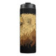 Retrato de perfil de león con arte tribal. un sol amarillo de mandala se sienta detrás del león con un fondo negro.