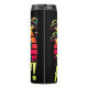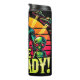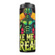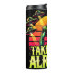 Un ilustracion dinámico y vibrante presenta a dos alienígenas de piel verde, uno grande y otro pequeño, que se oponen a un naranja audaz y a una puesta de sol de rayas amarillas. Varios platillos voladores con vigas brillantes descienden desde arriba. El prominente texto "¡TOMÁNDOME YA!" agrega un pedido humorístico y extraterrestre.