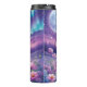 Este es un ilustracion con temática de fantasía de un majestuoso lobo blanco en un campo de flores coloridas bajo una gran luna llena de brillo. El lobo está adornado con delicadas flores rosas y blancas en la cabeza y la espalda. La escena está ubicada en un mágico bosque con árboles altos y oscuros, y el cielo está lleno de una vibrante exhibición de luces norteñas, estrellas fugaces y luces brillantes.