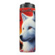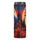 Este es un ilustracion con temática de fantasía de un majestuoso lobo blanco con ojos rojos brillantes. El lobo está pintado de perfil, rodeado por un bosque otoñal con hojas rojas y naranjas y pinos de silueta. El fondo cuenta con una gran luna roja llena y un cielo con murciélagos flotantes, estrellas y luces mágicas. Toda la escena tiene una estética mística y encantadora.