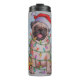 Perro de pug en Santa Claus gorra sentado y rodeado de luces de árbol de Navidad y regalos en sus costados