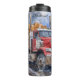 Esta imagen muestra un semicírculo rojo cargado de troncos, representado en un estilo acuarela, conduciendo a través de un bosque de invierno. El camino está mojado, reflejando la luz, y la nieve está esparcida por el suelo y los árboles. El fondo está formado por altos árboles de color verde oscuro y un cielo suave y turbio que crea una atmósfera serena pero escarpada.