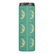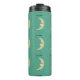 Presenta un ilustracion vintage de una luna creciente con un rostro. Hecho en amarillo claro y sobre un fondo turquesa. Un bonito diseño vintage.
