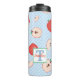 Tumbler térmico colorido del profesor de colegio, con gráficos de un punto de polka azul y patrón de manzana. Un área de texto cuadrado, en la parte delantera del tumbler, tiene un monograma de una sola letra y un texto personalizado de lectura, que puede personalizar o dejar tal como está.