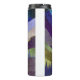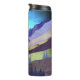 Un paisaje abstracto con texturas únicas que muestran un paisaje de montaña púrpura y lavanda con un impresionante cielo azul y rebaño de pájaros en tonos violeta, lavanda, beige, amarillo y rosa.