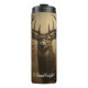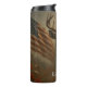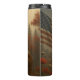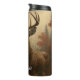 Esta imagen presenta un ciervo majestuoso con grandes cuerdas que sobresalen en un ambiente de bosque nebuloso. La bandera estadounidense ondea en el fondo superior izquierdo, mientras que árboles de color verde perenne y follaje otoñal enmarcan la escena. Las flores rojas están esparcidas en primer plano, y los pequeños pájaros vuelan en el cielo apagado y nublado, creando una serena y patriótica representación de la vida salvaje.