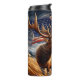 Esta obra de arte cuenta con una majestuosa alce con grandes cuerdas que sobresalen sobre una colina dorada y barrida por el viento. Detrás de la alce, una bandera norteamericana destrozada ondea dramáticamente contra un cielo nublado. Al fondo, un inmenso paisaje montañoso con bosques de pinos se extiende a lo lejos bajo un cielo atareado o tormentoso. La escena general evoca una sensación de patriotismo salvaje y belleza natural resistente.