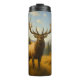 Un magnífico alce se alza orgullosamente en medio de un vibrante paisaje otoñal, con sus impresionantes ángulos dominando la escena. Los álamos dorados enmarcan al poderoso animal, mientras que los pinos altos y las montañas lejanas completan el paisaje pintoresco bajo un cielo azul claro. Los colores cálidos y ricos de la temporada son capturados con gusto, destacando la grandeza de este habitante salvaje.