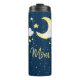 Fiestas temáticas Twinkle Twinkle Little Star de género neutro diseño de tumbler presenta acuarelas, incluyendo una hermosa luna de color agua en aumento flotando sobre nubes de color bonito blanco y rodeada de estrellas de color amarillo acuático. El diseño se acentúa con pequeñas estrellas y tipografía de pincel con letras a mano, sobre un fondo azul marino. "Género neutral, nueva mamá, regalos para mamá.