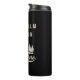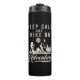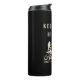 Este tumbler termal es perfecto para los amantes del senderismo. El diseño incluye las palabras "Mantén la calma y la caminata", y "Aventura espera" con una silueta de excursionista, montaña, árboles, sol, pájaro y hierba entre las palabras. Esto hará un gran regalo para un excursionista.