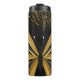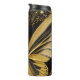 Mariposa amarilla dorada brillante sobre fondo negro con un diseño ornamental con elegantes remolinos.