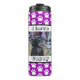 Sube la foto de tu perro o gato a este lindo portador de bebidas térmicas fotográficas del corazón. Fondo de las huellas blancas.