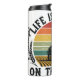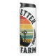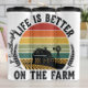 Diseño gráfico rústico con temática campesina. La imagen central tiene un granero negro con molino de viento y está situada en un campo arado con una cerca de madera y fajas de trigo. El fondo es una vibrante puesta de sol con rayos de sol y nubes de varios colores. La frase "LA VIDA ES MEJOR EN LA GRANJA" se muestra de forma destacada por encima y por debajo de la escena en una letra negrita y caprichosa.
