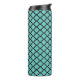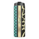 En este elegante tumbler termal se encuentra un elegante patrón de quatrefoil sobre un fondo turquesa con una brillante cinta dorada donde se puede personalizar y al lado de la cinta se encuentra un diseño de jirafa exótica que crea vibraciones de moda de moda.