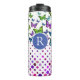 Tumbler monogramado con mariposas de bonito y diseño de puntos en azul, verde y morado.