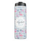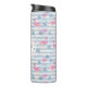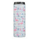 Botella de agua con un patrón con una divertida vibra veraniega. Flamencos rosados y piñas puestas en un patrón de rayas azul claro con hojas y corazones alrededor.