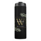 Elegantes hojas de vegetación en acuarela con monograma de nombre en taza térmica con inicial de monograma dorado sobre fondo negro elegante. Diseñado por Thisisnotme©