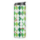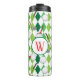 A los golfistas les encantará esta bebida de golf con temática de golf con estampado de bolas de golf en los tés, sobre un fondo de estilo de argyle verde. Hay un círculo de monograma en la parte delantera para que añadas tu propia inicial