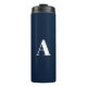 Monograma personalizado letra inicial Tumbler térmico azul marino oscuro y blanco. Diseño minimalista, moderno y elegante
