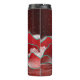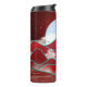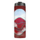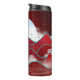 Resumen de diseño paisajístico en varios tonos de rojo con un amanecer, colinas, árboles, nubes y pájaros.