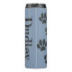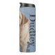 imagen de perro en la taza térmica con "Dudley" y huellas de pata.
