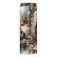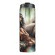 Esta imagen retrata una escena pacífica a través de un cuerpo de agua calmado, reflejando el entorno. Una joven de cabello largo y ondulado, adornada con ropas de inspiración indígena y un detallado tocino de plumas, se sienta descalzo en la orilla rocosa. A su lado se encuentra un gran oso marrón, su reflejo visible en el agua. Una pequeña fogata arde suavemente en el fondo cerca de un refugio sencillo. La decoración de ensueño se cuelga de un árbol cercano y crea un ambiente tranquilo.