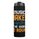 Music Makes The World Go Round in orange and blue on black. Makes a great gift for singers and musicians or anyone else who just truly loves music!
