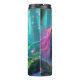 A magical horse with a vibrant, flowing pink and yellow mane and tail walks through an enchanted forest bathed in soft blue and green light. Swirls of light adorn its dark blue coat, and delicate butterflies flutter nearby, creating a whimsical and dreamlike scene.