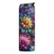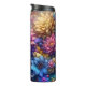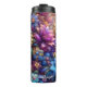 Esta imagen es una composición vibrante e intrincada de varias fantásticas flores y follaje en colores ricos y profundos. Dominan los tonos morados, azules, rosas y amarillos, con acentos brillantes y detalles brillantes que dan la impresión de un jardín mágico y de ensueño por la noche. Las pequeñas fuentes luminosas contribuyen a crear un ambiente etéreo.