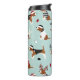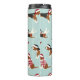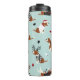 Beagles bonitos vestidos con trajes festivos, sombreros de Papá Noel y suéteres de argyle con adornos navideños dispersos sobre un fondo azul.