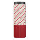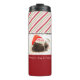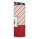 Un tumbler terno con una adorable foto de un cachorro durmiendo mientras usa un sombrero de santa. Feliz Navidad está escrito en la banda de su gorra, con una moderna letra escrita a mano. Un borde oscuro con luces de Navidades coloridas rodea el marco de esta bonita foto. El fondo es un patrón festivo rayado de caña de caramelo en blanco y verde rojo. El texto del personalizable en la parte inferior dice: Peace Joy y Pugs.