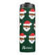 Un nombre personalizado Navidad un tumbler térmico con una cara de Santa negra ilustrada en un fondo verde. Simplemente personalizar el nombre, agrega este vaso a tu carrito, y ¡ten una feliz Navidad!