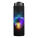 Luciérnagas mecánicas antiguas con bombilla de luz y finas alas brillan naranja, violeta, turquesa sobre fondo negro. Estilo Steampunk.