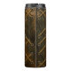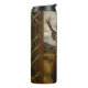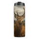 Se destaca un majestuoso escenario con impresionantes cuerdas, que mira directamente hacia delante en un marco de suaves colinas onduladas y un cielo nublado. La imagen central del ciervo está flanqueada por unos bordes decorativos que se asemejan a un cuero lacado con agujas y conos de pino, lo que crea un marco rústico de temática salvaje.