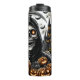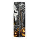 Esta imagen clásica de Halloween presenta una amenazante Parca con brillantes ojos naranjas y un guadín, que se cierne sobre varias luciérnagas lámparas jack-o'. Se alza un castillo espeluznante y embrujado contra una luna llena en el cielo nocturno, junto con murciélagos voladores y niebla giratoria, lo que crea una escena festiva y escalofriante.