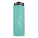 Personalice su nombre verticalmente en blanco Script Text en fondo verde azulado claro. Haga clic en "Personalizar" para cambiar colores y estilos de tipo.