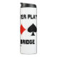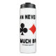 Si sientes que nunca puedes jugar mucho puente y a altas horas de la mañana en torneos de bridge, disfrutarás de este vaso termal con los cuatro trajes de cartas y el dicho "Nunca se puede jugar demasiado puente". Haga que otros hagan una toma doble con una dosis de puente de lengua en mejilla / estilo de puente duplicado hoy con este tumbler térmico!