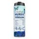 A creative design, styled as a "Nutrition Facts" label, humorously lists a "Miracle Nurse's" daily values for "Compassion," "Courage," and "Patience." It is set against a light blue background adorned with numerous blue butterflies. A cluster of deep blue roses and a subtle heart-shaped stethoscope line the bottom, creating a heartfelt and imaginative tribute. Replace the name with your name